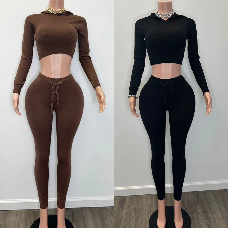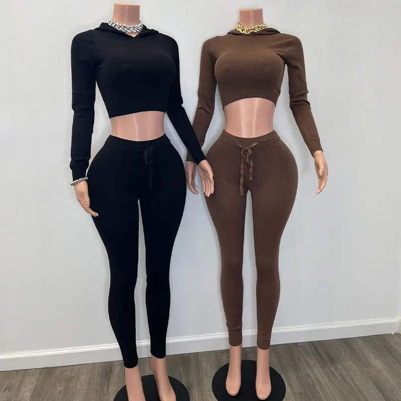Huili Manufacturer Knitted Hooded Crop Top & Leggings Two Piece Sweater Set Custom Logo Women's Sports Loungewear Sets for Women